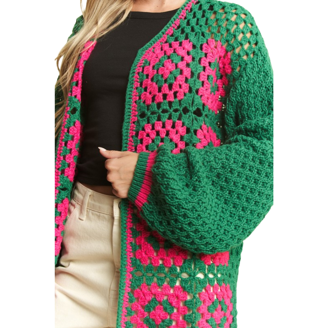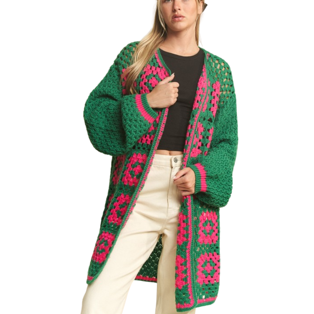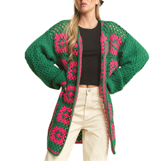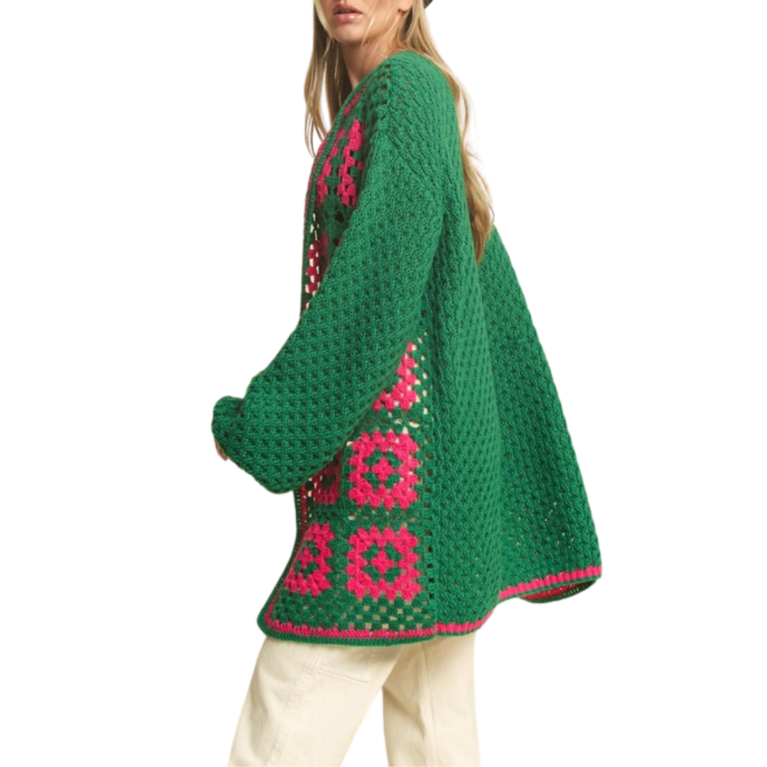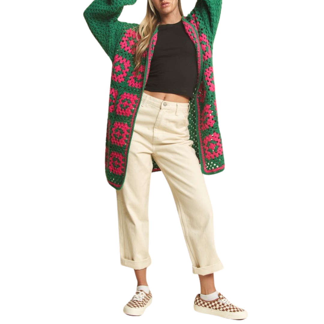 Add a touch of vintage-inspired charm to your wardrobe with this Two-Tone Floral Square Crochet Open Knit Cardigan. Featuring a delicate open-weave knit design, this cardigan blends artisanal craftsmanship with a modern, airy silhouette. The loose fit and open-front design make it a versatile layering piece, perfect for effortlessly elevating any outfit.