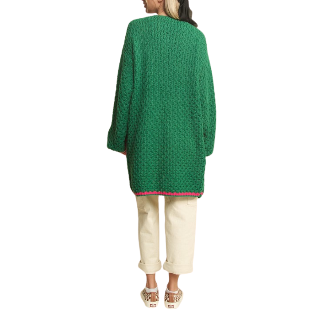 Crafted from 100% recycled polyester, this sustainable knit cardigan offers lightweight breathability and eco-conscious style. Whether paired with denim for a relaxed daytime look or layered over a slip dress for bohemian elegance, this cardigan is a timeless staple for any season.