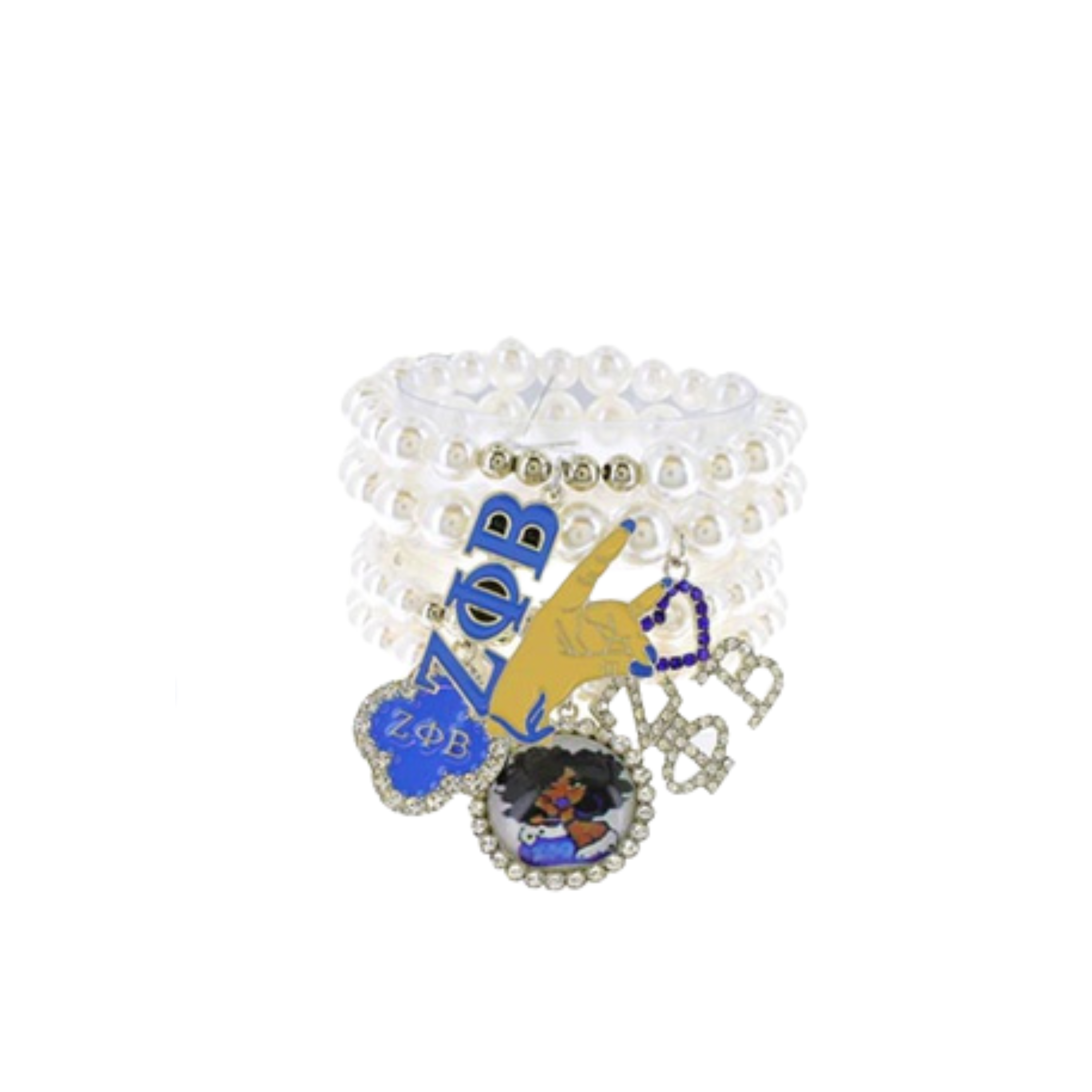 Celebrate the legacy of Zeta Phi Beta Sorority, Incorporated with this stunning 4-Strand Multi-Charm Bracelet, designed in the signature royal blue and white color palette. This piece blends enamel-coated details, crystal rhinestones, and pearl-style beading to create a polished, eye-catching accessory worthy of every Finer Woman.