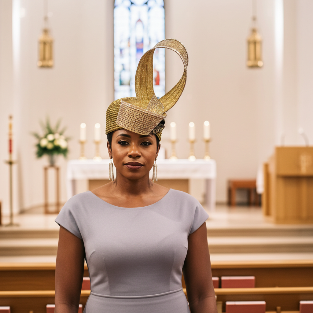 Woman wearing a decorative headpiece in a church setting
