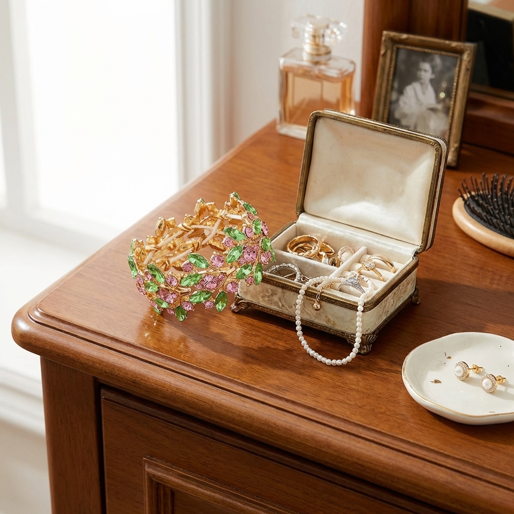 Gold bracelet with green and pink gemstones on a light gray background