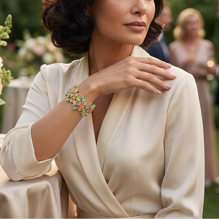 Set in a polished gold-tone framework, the alternating pink and green crystals form an eye-catching botanical pattern that feels both graceful and bold. The marquise stones resemble leaves while the round stones create soft floral centers, giving the bracelet a dimensional, nature-inspired design.