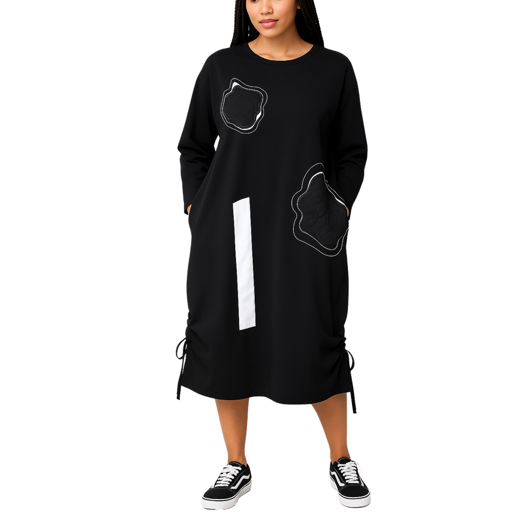 Artsy Black Midi Dress with White Panels & Drawstring