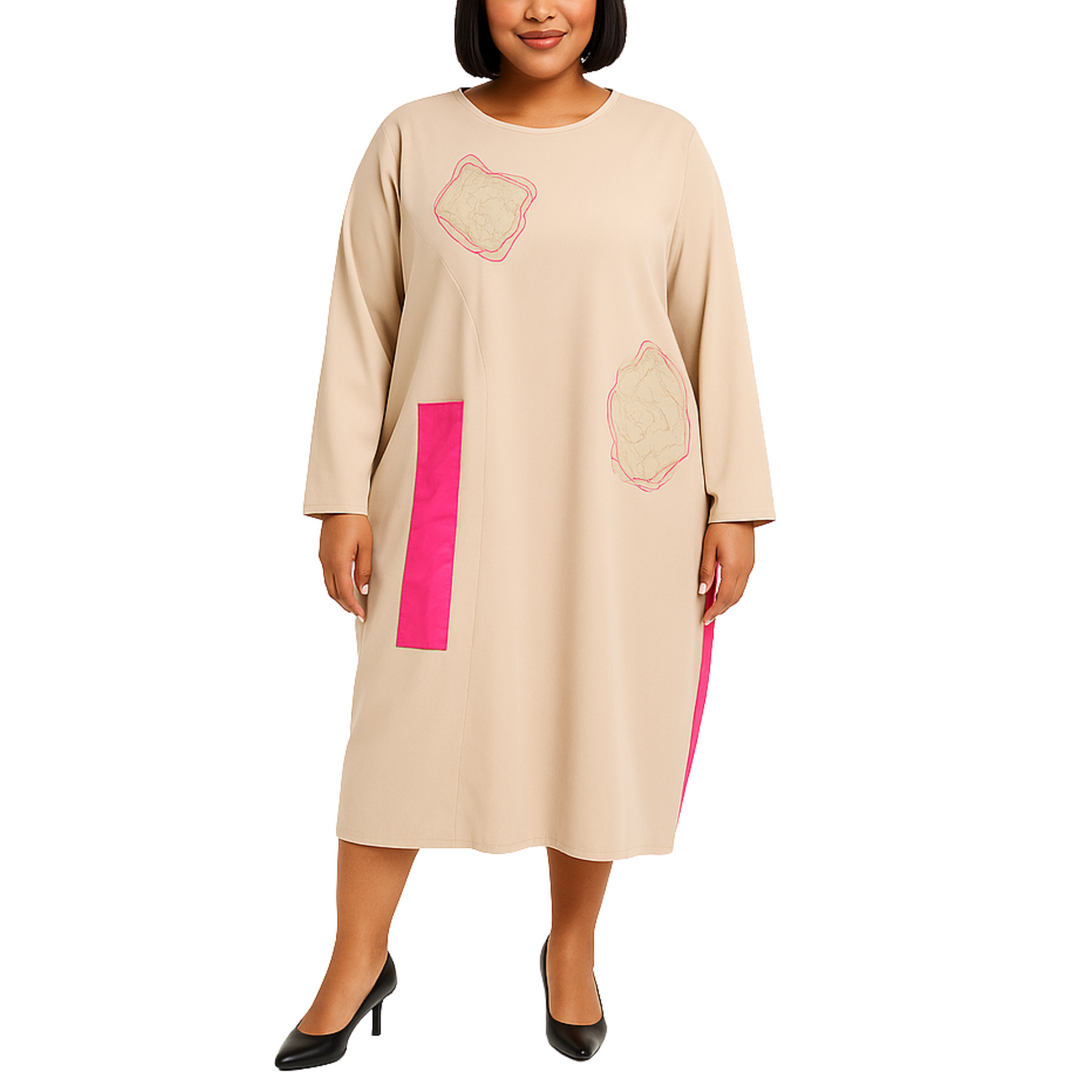 Artsy Beige Midi Dress with Fuchsia Panels & Drawstring