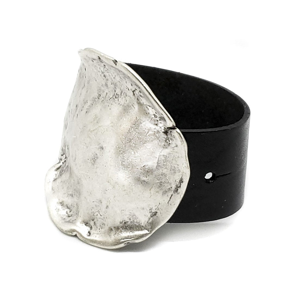 Genuine Leather handmade rectangular pewter discs with genuine leather strands laced through the disc. Leather hook closure.