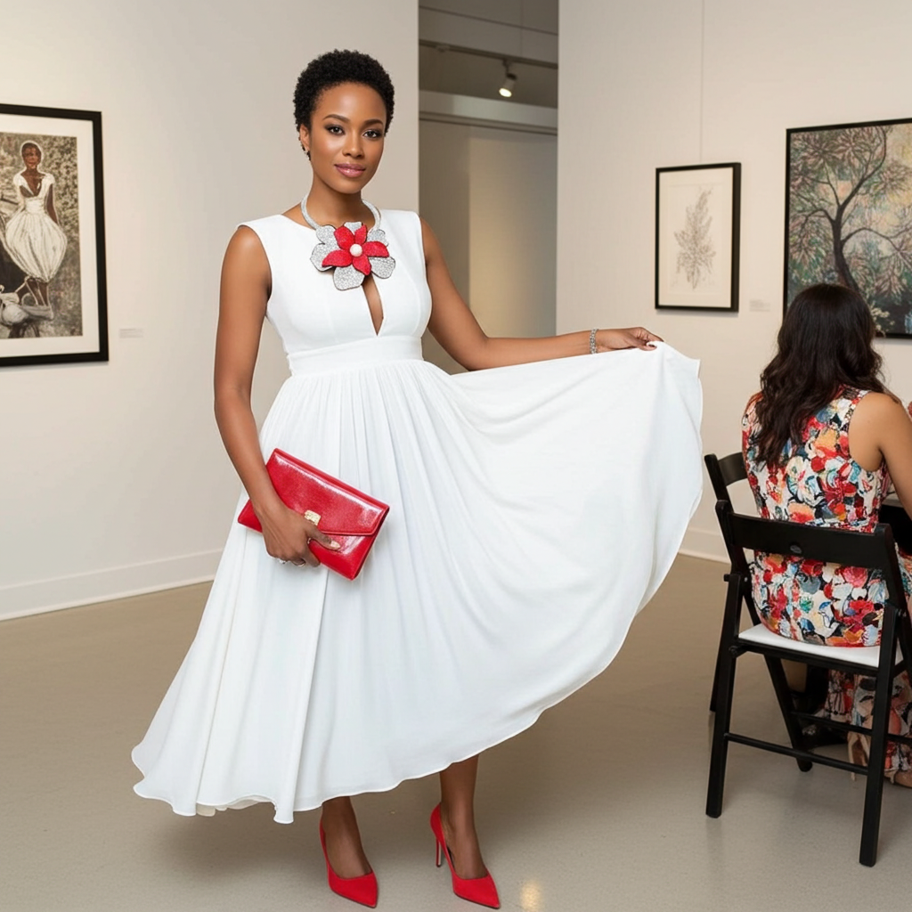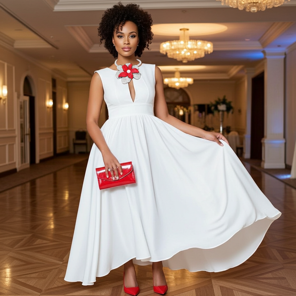 Woman wearing a white top with a red floral accessory on a white background
