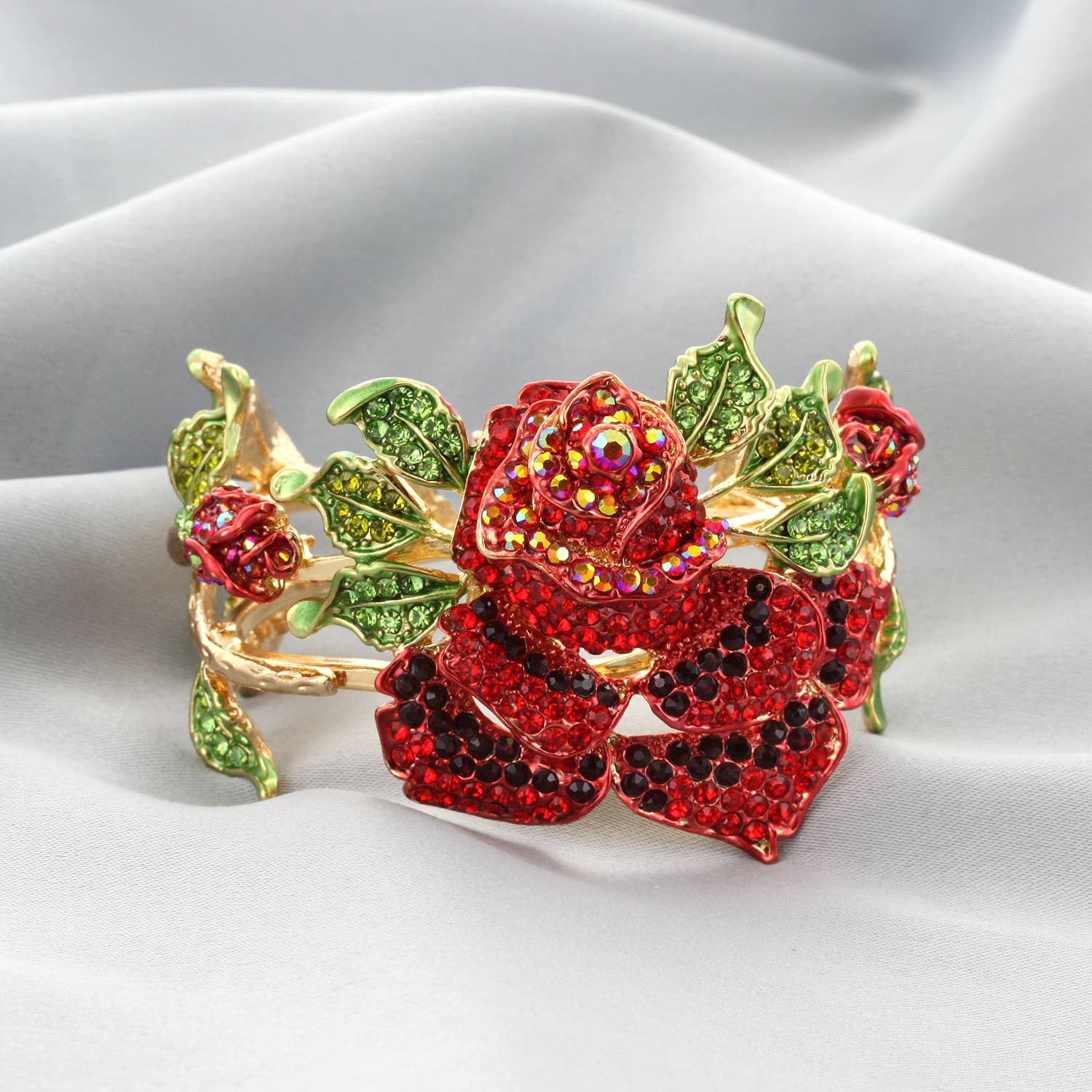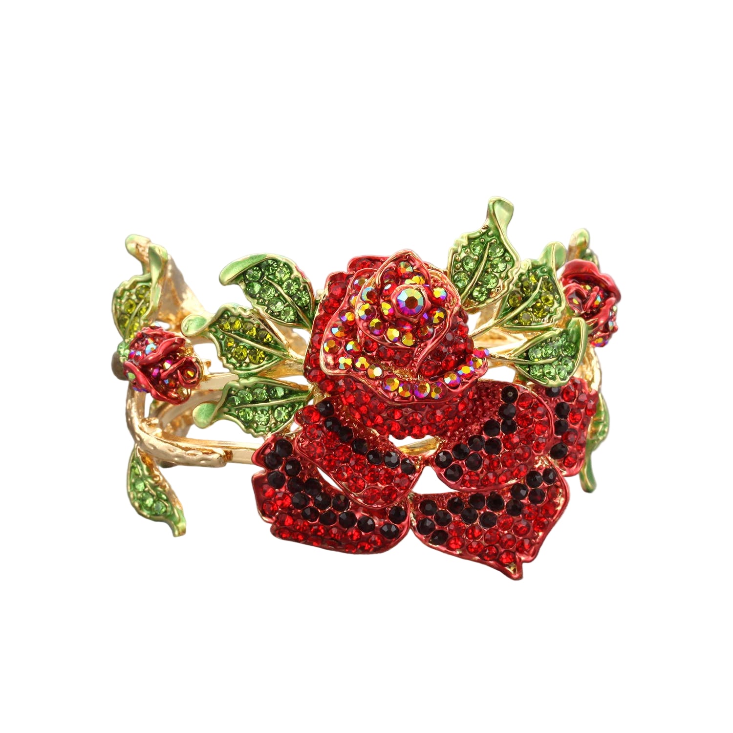This oversized hinge bracelet features a bold rose motif encrusted with sparkling rhinestone pavé, offering an elegant, corsage-inspired design that commands attention. Finished in your choice of polished gold or silver tone, its lightweight yet substantial silhouette makes it a glamorous statement accessory for any special occasion. The hinge closure ensures a secure, comfortable fit while adding ease of wear.