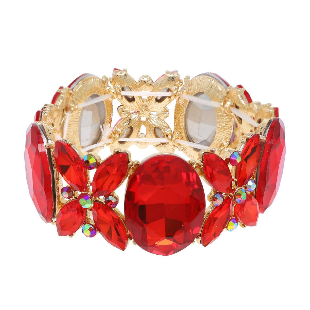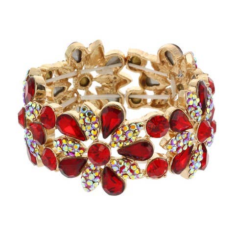Floral Rhinestone Gem & Cluster Evening Stretch Bracelet: Red