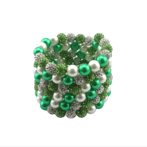 Green & White Memory Wire Beaded Bracelet – Crystal Pave & Pearl Bracelet