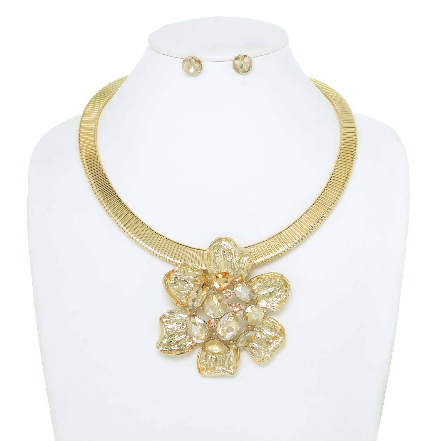 Floral Gemstone Snake Collar Necklace Set: Gold Crystal