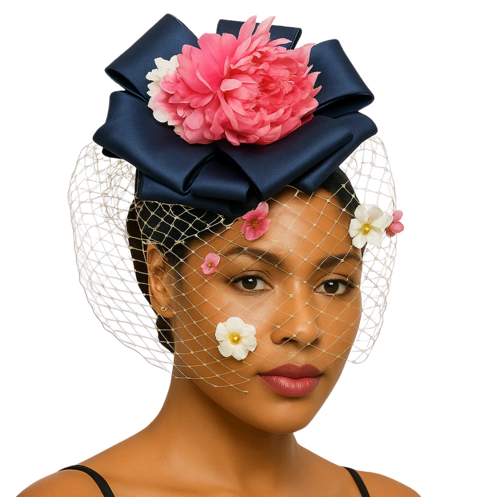 Whittall & Shon CACHE Flower Veil Fascinator – Navy with Pink Bloom