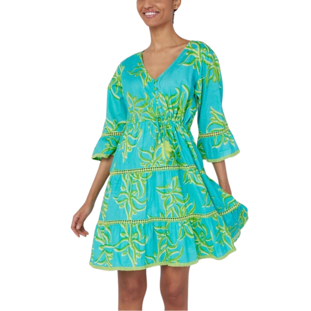 Introducing the Cadenza dress: a luxurious must-have for the spring and summer season. Crafted from a soft and warm cotton, this classic dress features short sleeves, a relaxed fit, and a chic collar adorned with fringe trim. The unique and bold tropical blue and red coral motif provides an eye-catching layer of detail that’s sure to turn heads.