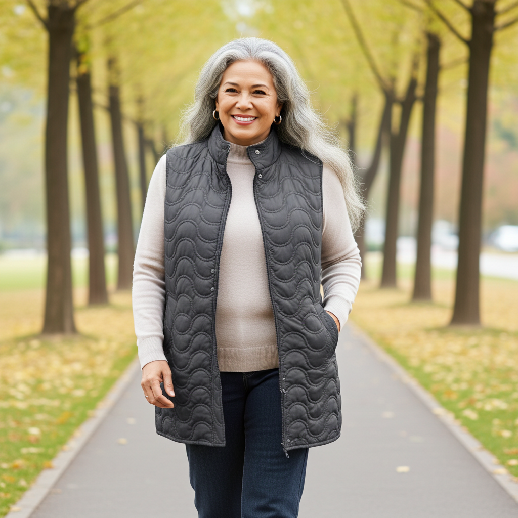 Woman wearing a gray quilted vest in a park with trees and grass.