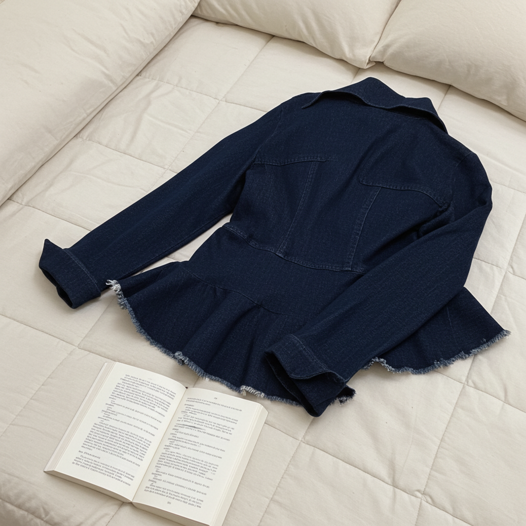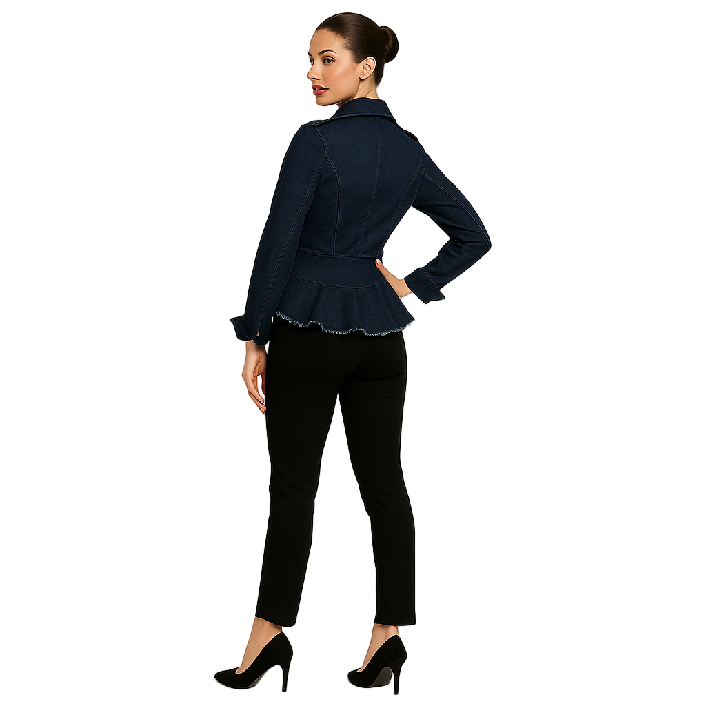 Elevate your denim collection with the Samuel Dong Denim Motorcycle Jacket, a chic twist on a timeless classic. This fitted jacket features a structured moto-inspired silhouette with a feminine peplum hem for a flattering finish. Crafted with Samuel Dong’s signature attention to detail, the raw edge trim adds modern texture while the asymmetrical zip closure keeps the look edgy yet refined.
