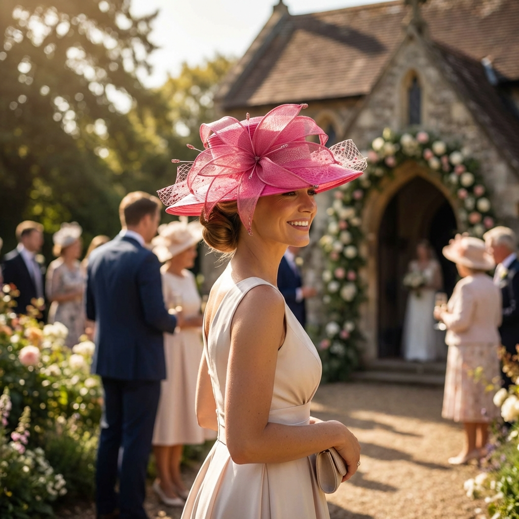 Command attention with this exquisitely sculpted hot pink wide-brim hat, designed for women who appreciate refined elegance and dramatic flair. Crafted from a premium blend of polyester and sinamay, this sophisticated piece features a beautifully structured crown accented by a sweeping sinamay ribbon flower that cascades gracefully across the silhouette.