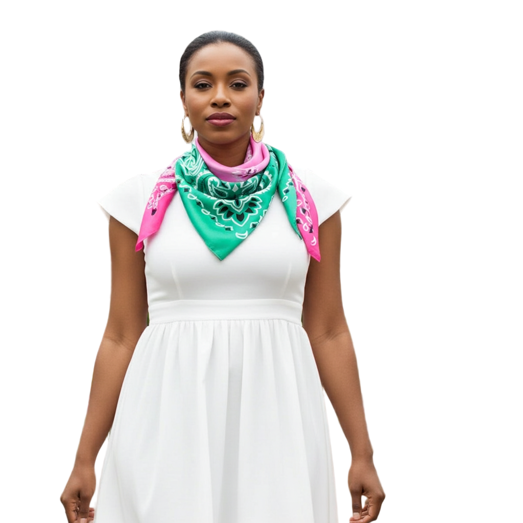 Add a pop of color and timeless charm to your wardrobe with this Pink & Green Paisley Print Bandana. Designed with a classic paisley pattern in a bold pink and green mix, this silky square scarf is both versatile and effortlessly stylish. Made from 100% polyester, it offers a smooth, lightweight feel that drapes beautifully. Whether worn as a headscarf, necktie, wrist wrap, or handbag accessory, this bandana is the perfect finishing touch to any outfit.