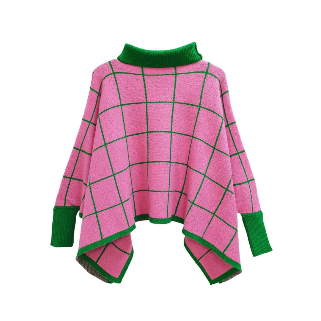 Pink & Green Plaid Cowl Neck Poncho – Cozy, Chic & Timeless