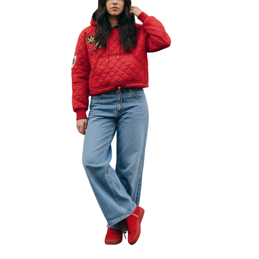 Wrap yourself in the comfort of this relaxed, quilted and hooded sweatshirt with an adjustable waist. Featuring college-style patches on the front and shoulder. Made from recycled fibres.
