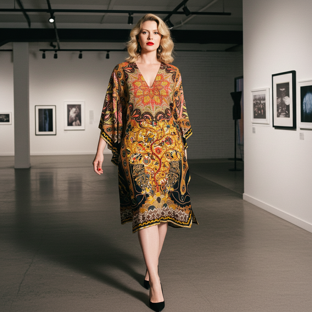 Precioso y único vestido Alexxia con estampado paisley en una mezcla de beiges y marrones de Blank London. Cada pieza de Blank tiene un diseño único que la hace especial. Este vestido tiene un estilo caftán con mangas fluidas y aberturas laterales.