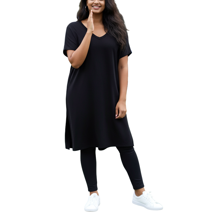 Un vestido camisero oversize con elegantes aberturas laterales. Un look boho chic que combina estilo y comodidad. Este vestido queda genial con nuestros leggings, y todos los colores combinan a la perfección juntos o por separado.