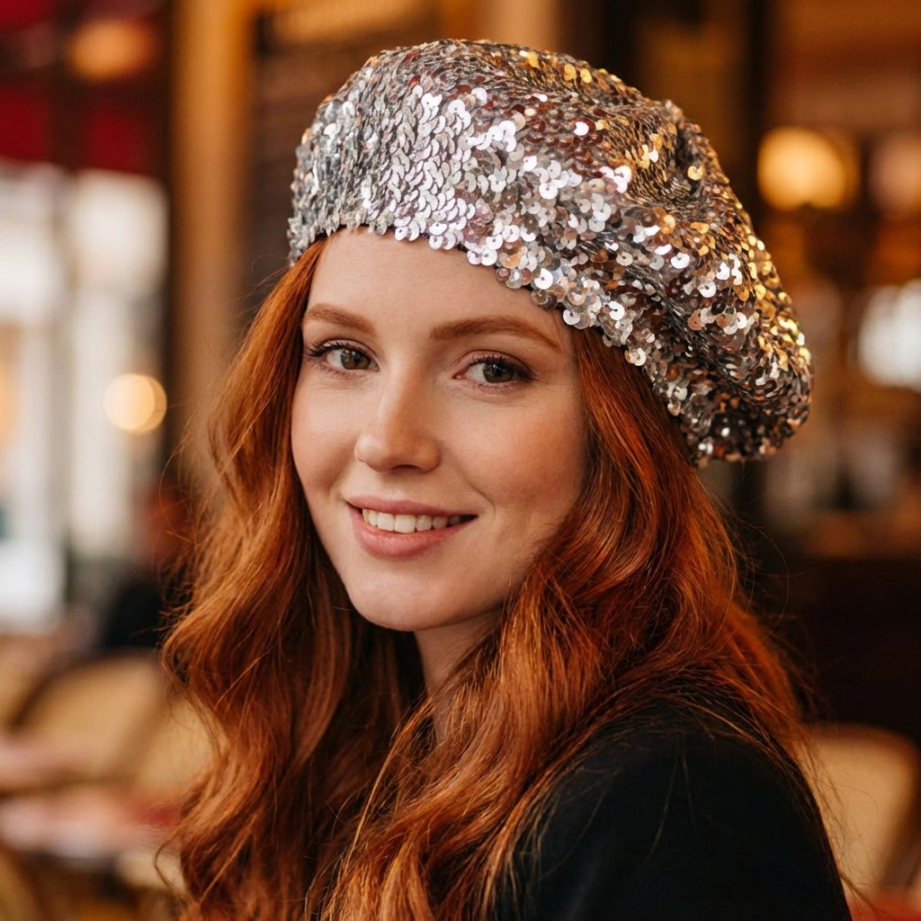Mejora tu colección de accesorios con nuestra boina con lentejuelas ajustadas y banda de terciopelo, disponible exclusivamente en nuestra exclusiva boutique.