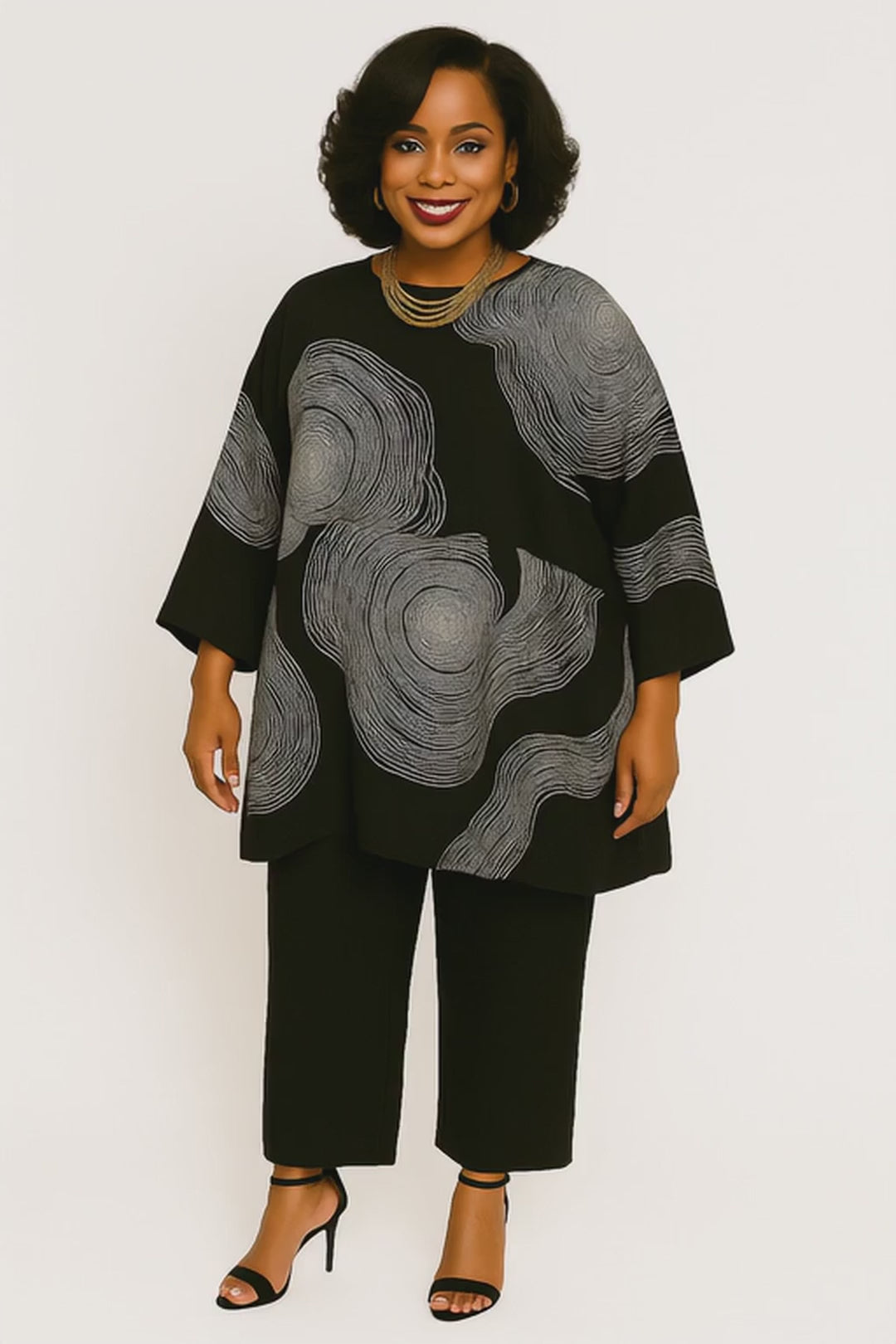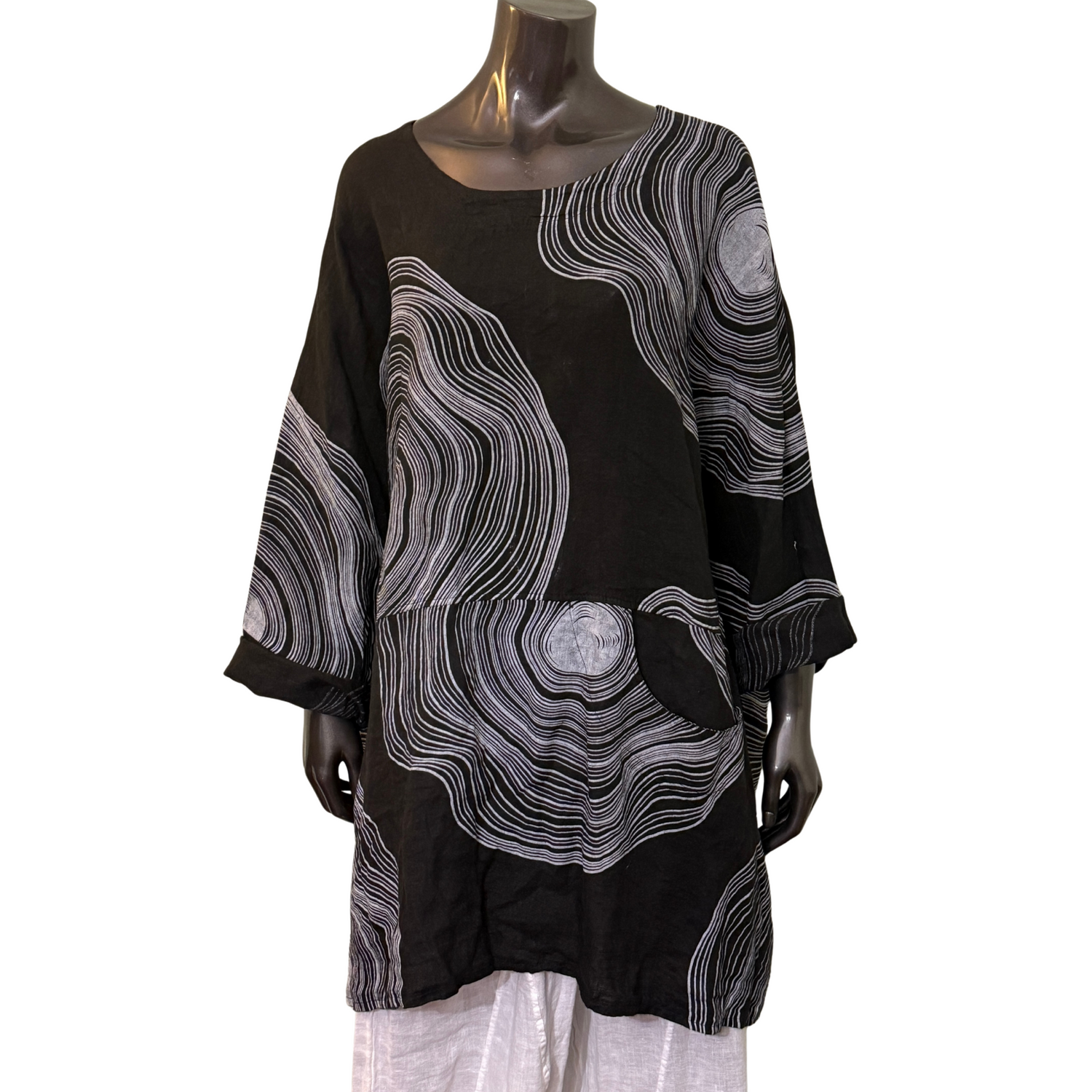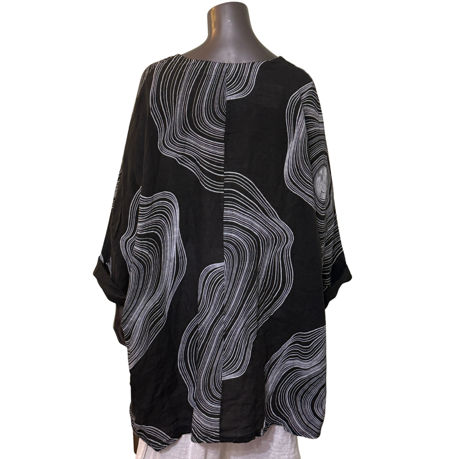 La audacia se une a la sencillez en el Top Blossom de T by Transparente: una túnica impactante, tan artística como fácil de llevar. Confeccionado en gasa de lino negra, transpirable y ligera, este top presenta un estampado abstracto de anillos orgánicos negros que evoca la belleza de las piedras de ágata natural.