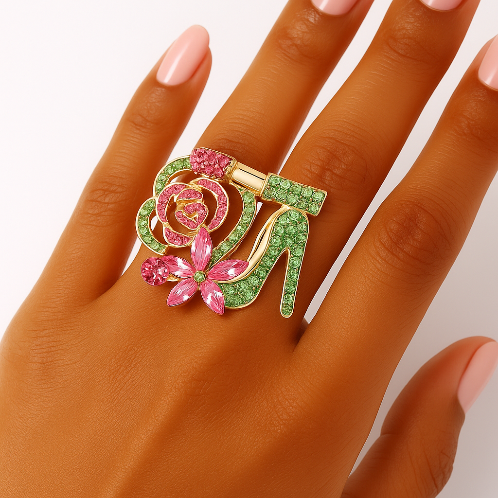 Turn heads with this bold  Red & White/Silver Women’s Cocktail Ring, designed for women who love playful glamour with a luxe edge. This luminous gold-metal stretch band ring features an ultra-detailed trio motif: a sparkling lipstick, a crystal-encrusted high heel, and a floral swirl — all brought to life with premium red and silver rhinestones.