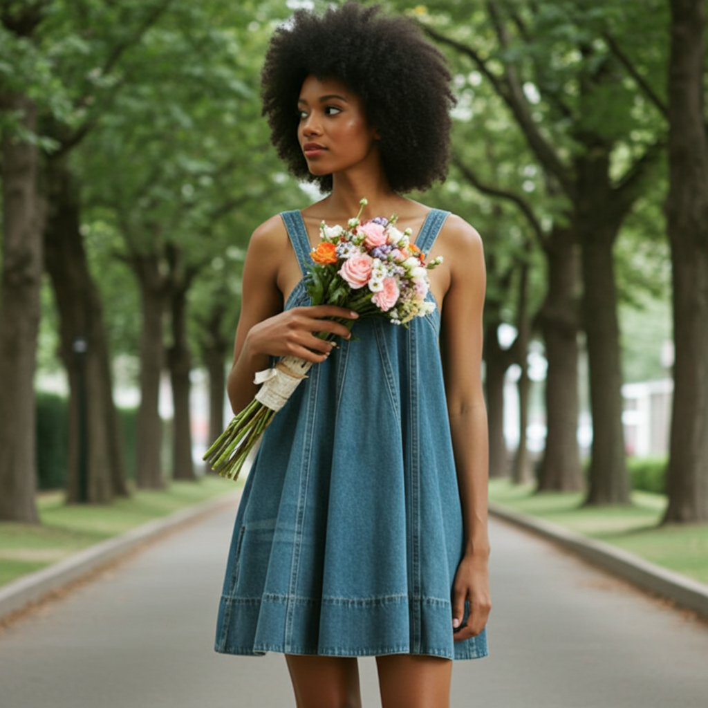 Presentamos nuestro minivestido acampanado con escote cuadrado en denim tejido, una combinación perfecta de encanto informal y estilo contemporáneo.