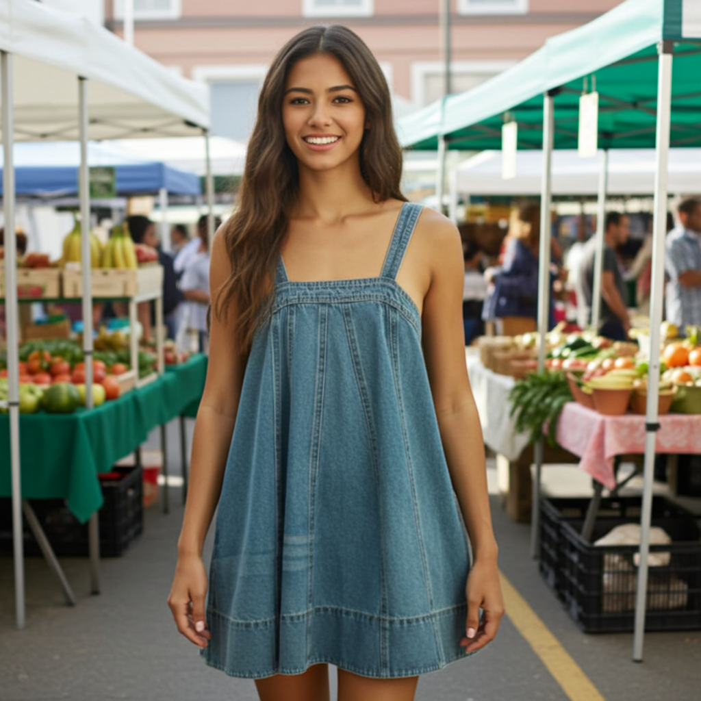 Confeccionado con una mezcla de alta calidad de 90 % algodón y 10 % viscosa, este vestido ofrece una sensación suave y transpirable que te mantiene cómoda todo el día. El escote cuadrado y el diseño sin mangas crean una silueta favorecedora, mientras que la minifalda con vuelo le da un toque divertido.