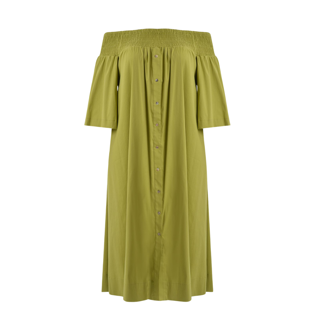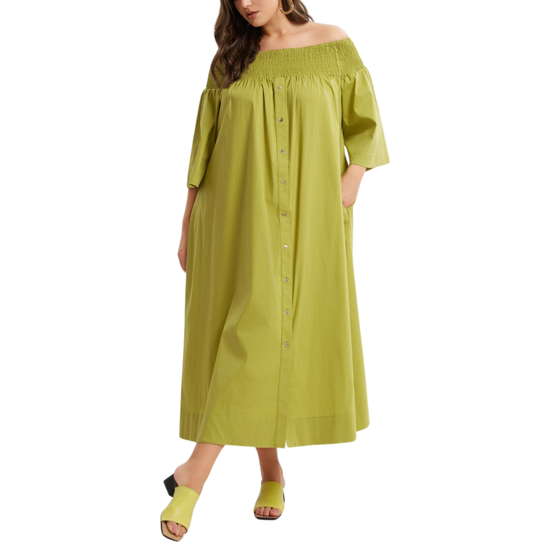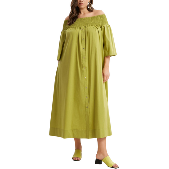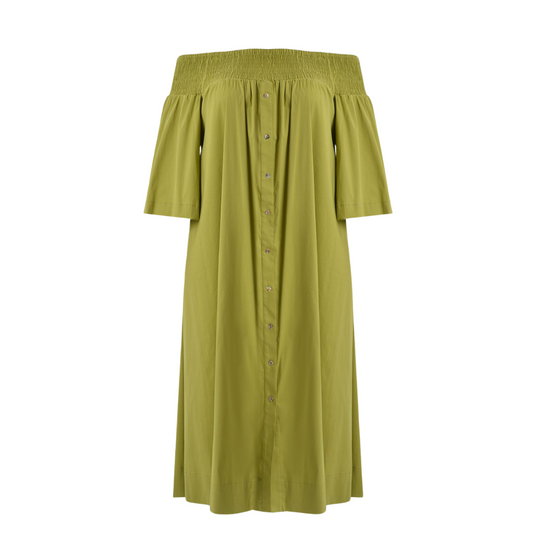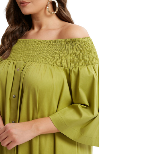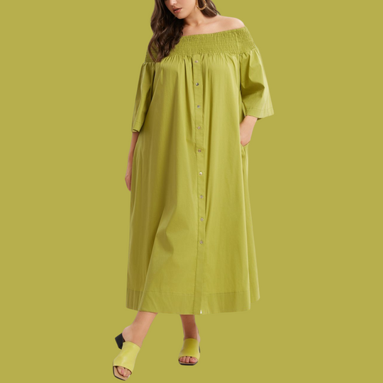 Fresco y favorecedor, este vestido fruncido con hombros descubiertos de Mat Fashion combina a la perfección la elegancia informal con la comodidad del verano. Confeccionado en un vibrante verde chartreuse , el vestido presenta un amplio escote fruncido que permite lucirlo al descubierto para una silueta atrevida y femenina.