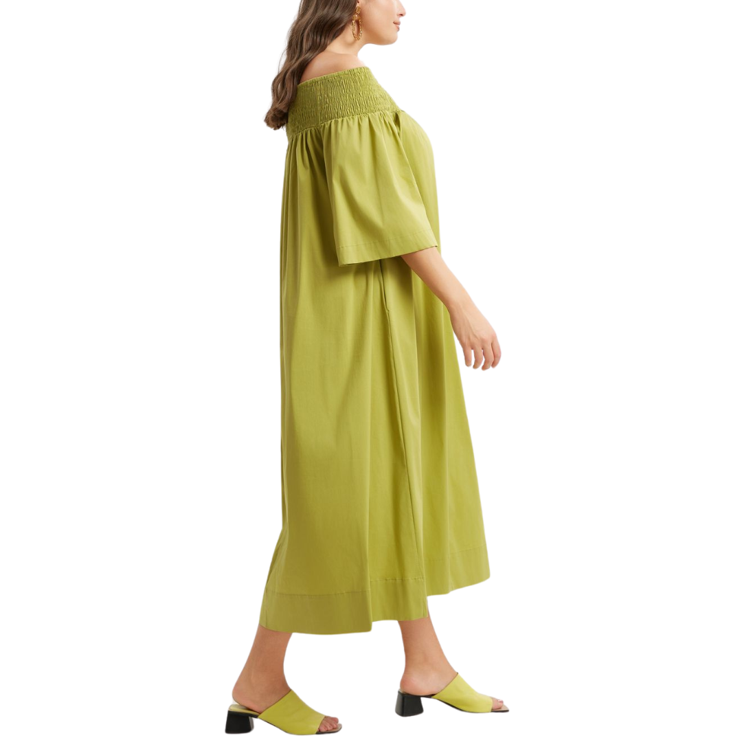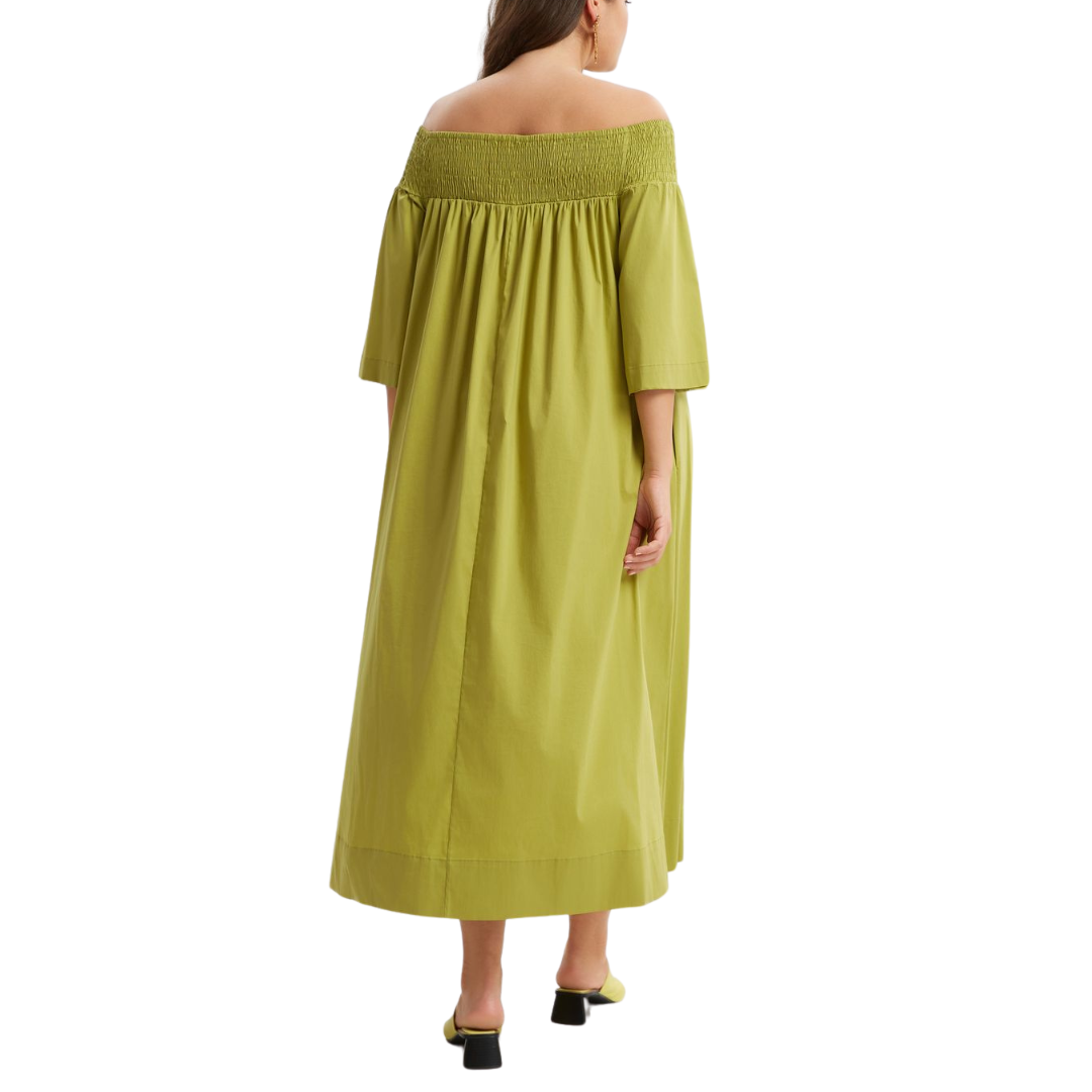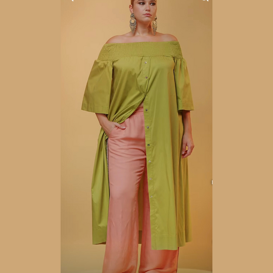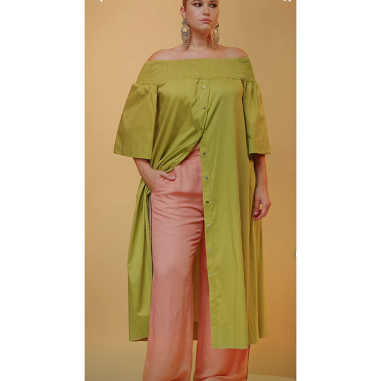 Fresco y favorecedor, este vestido fruncido con hombros descubiertos de Mat Fashion combina a la perfección la elegancia informal con la comodidad del verano. Confeccionado en un vibrante verde chartreuse , el vestido presenta un amplio escote fruncido que permite lucirlo al descubierto para una silueta atrevida y femenina.