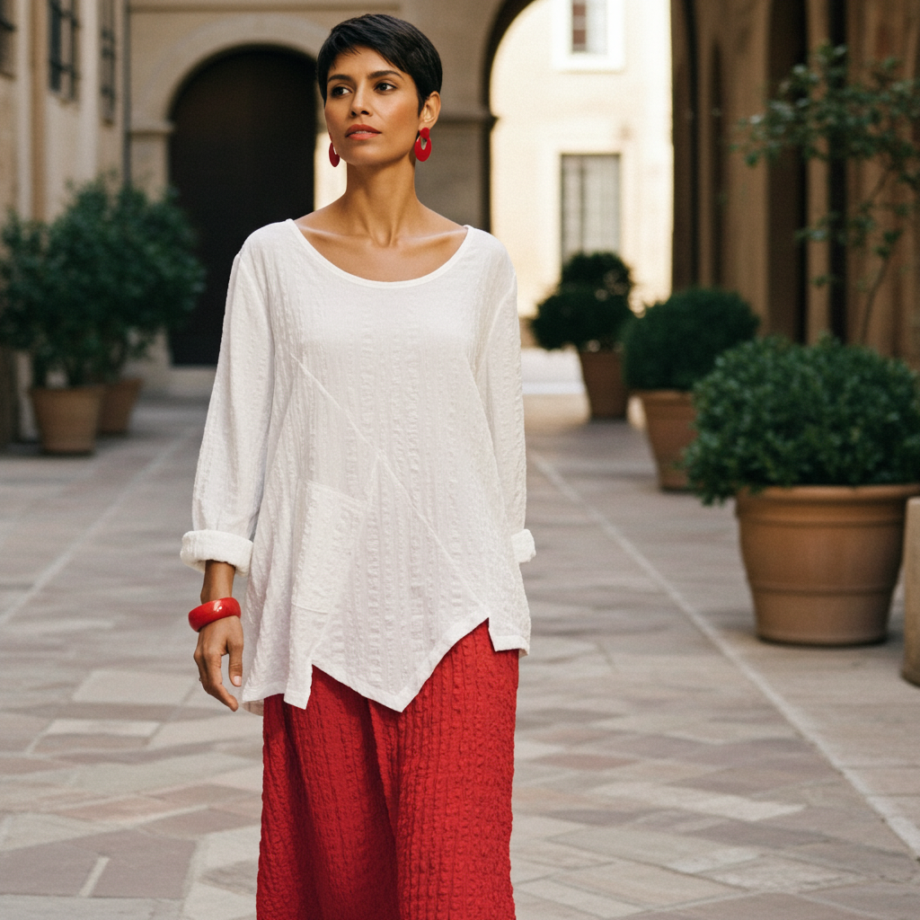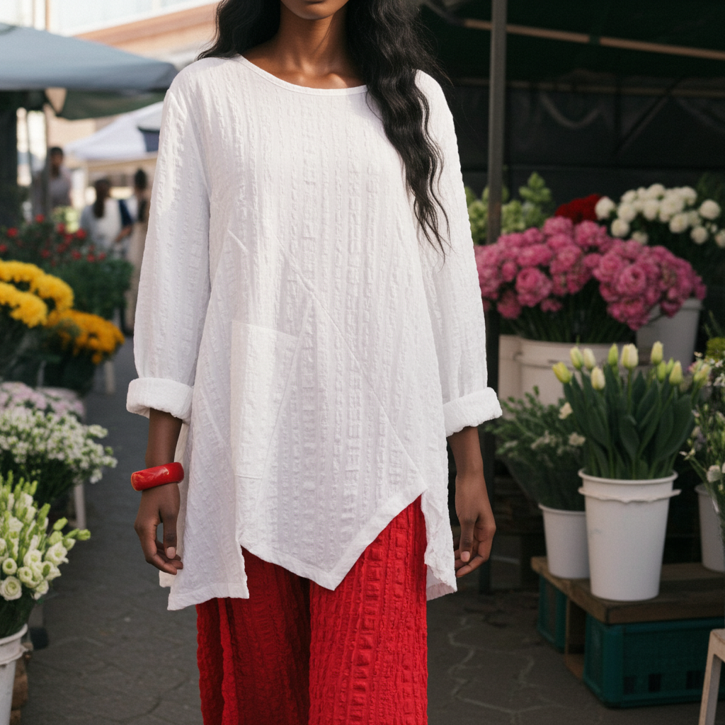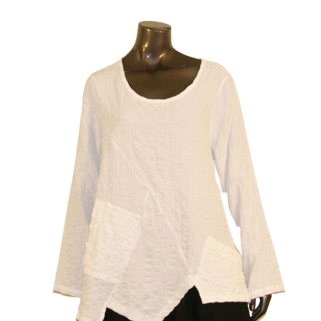 Y&S Fashion Designers es una división de Moonlight Inc., cuyos tops y chaquetas están confeccionados a la perfección. Elegante y sencillo, este top presenta una textura granulada y un corte holgado. Incluye cuello redondo y mangas más largas. La parte delantera tiene dos bolsillos y el bajo es irregular. Combina a la perfección con la falda Pebble Bubble a juego (que se muestra y se vende por separado).