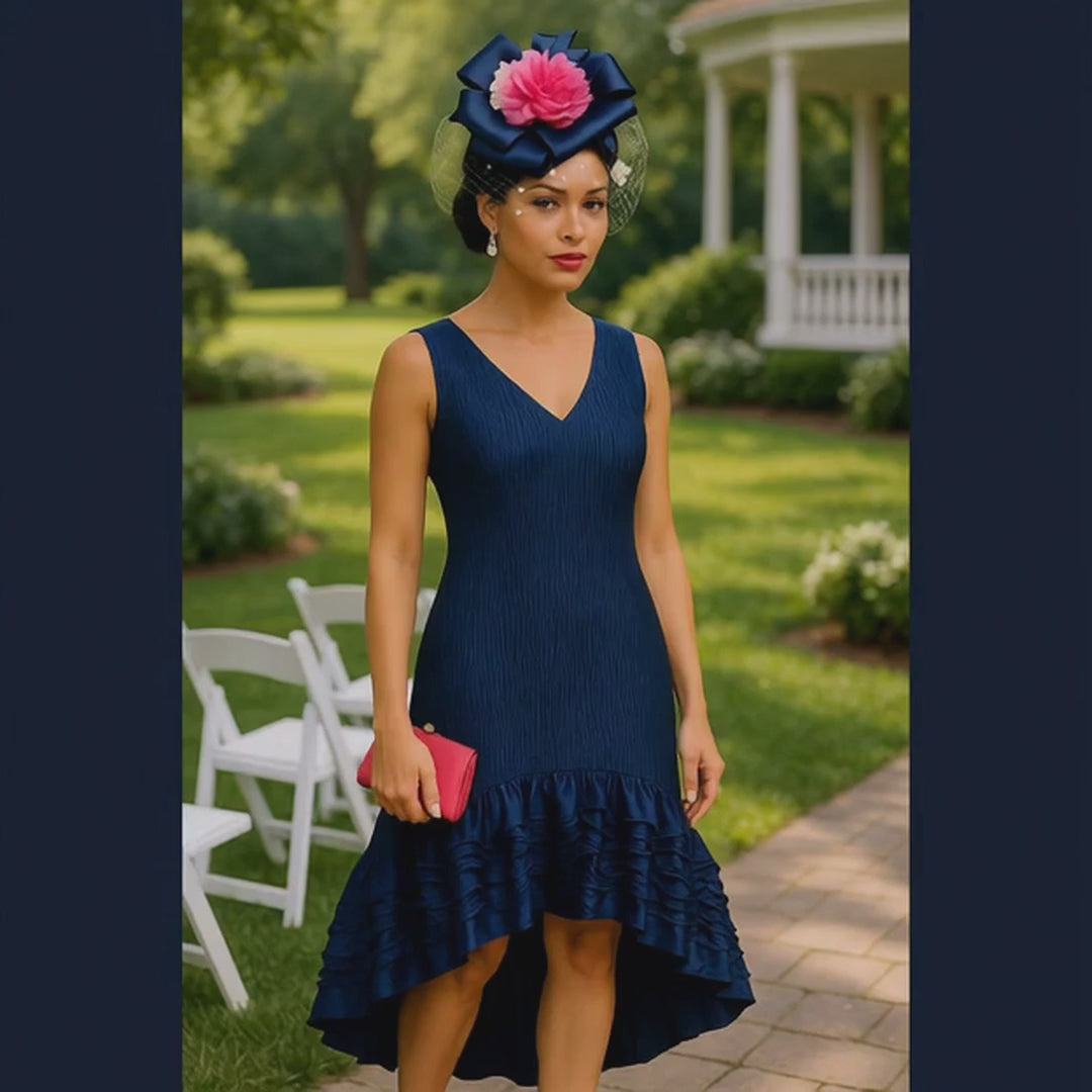 El encanto vintage se fusiona con la elegancia escultural en el tocado CACHE de Whittall & Shon : un refinado gorro estilo Julieta que se coloca con naturalidad sobre una discreta diadema. Envuelto en satén azul marino intenso , este tocado luce un llamativo lazo de múltiples puntas , rematado con una voluminosa peonía de color rosa fucsia que le da un toque floral lujoso.