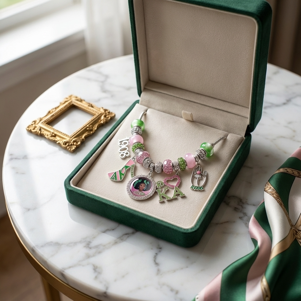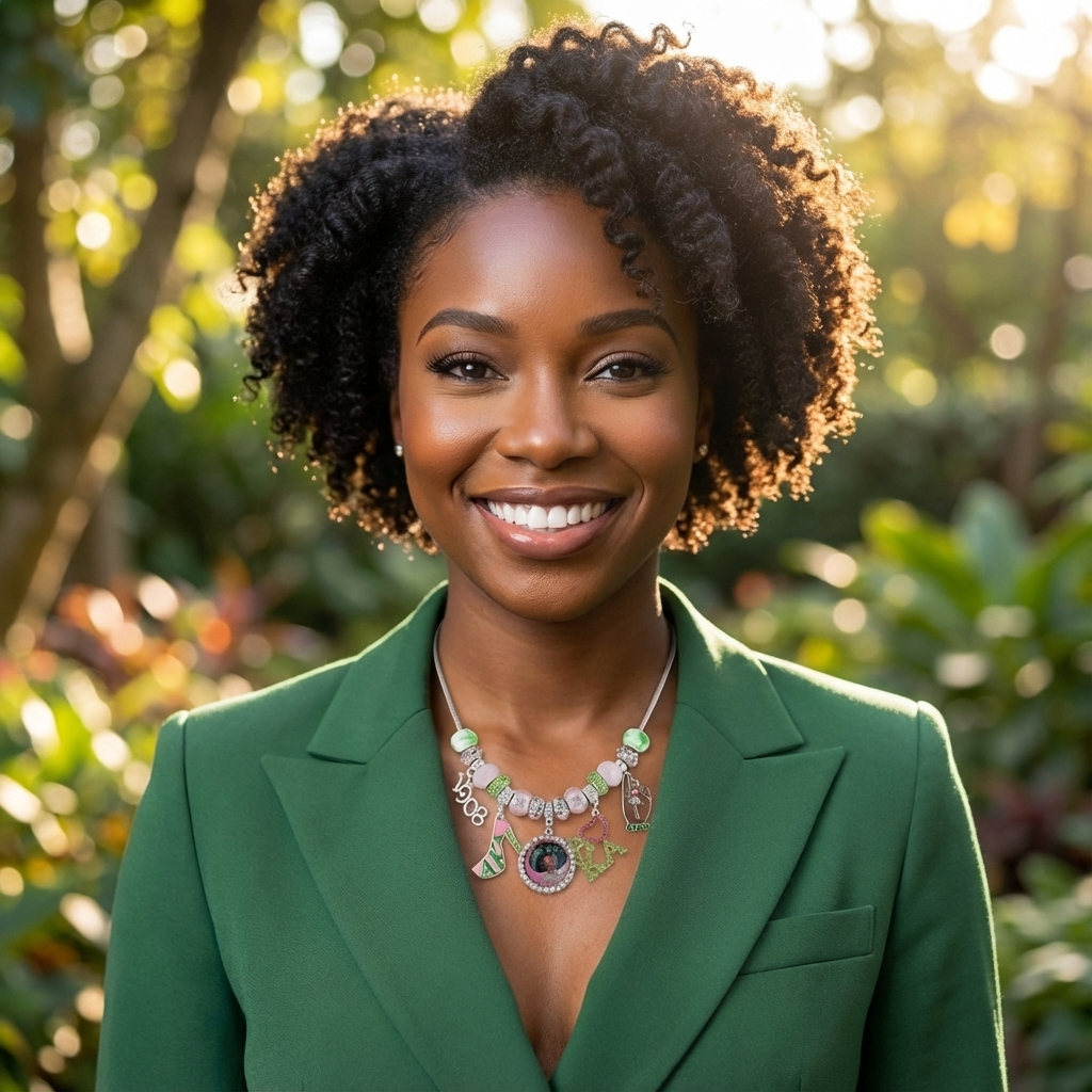 Celebrate sisterhood and style with this Alpha Kappa Alpha multi-charm necklace crafted in silver-tone metal. Each charm showcases signature pink and green enamel details, sparkling crystal rhinestones, and exquisite craftsmanship that captures the spirit of AKA pride. Designed with multiple symbolic charms, rhinestone-accented beads, and a comfortable adjustable chain, this piece brings radiance to any outfit — from chapter meetings to special events.