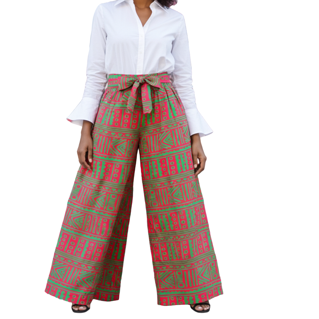 Woman long wide leg pant. 100% wax cotton. Elastic waist with sash. Has side pockets. Long length. Matching head scarf included. Free size fits S to 3XL. Color: pink / green tone