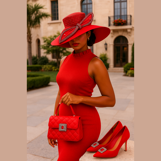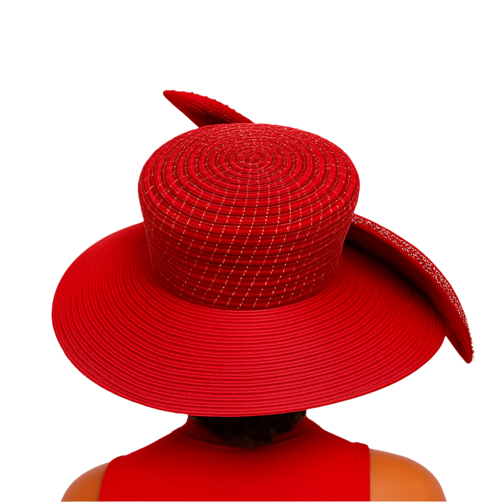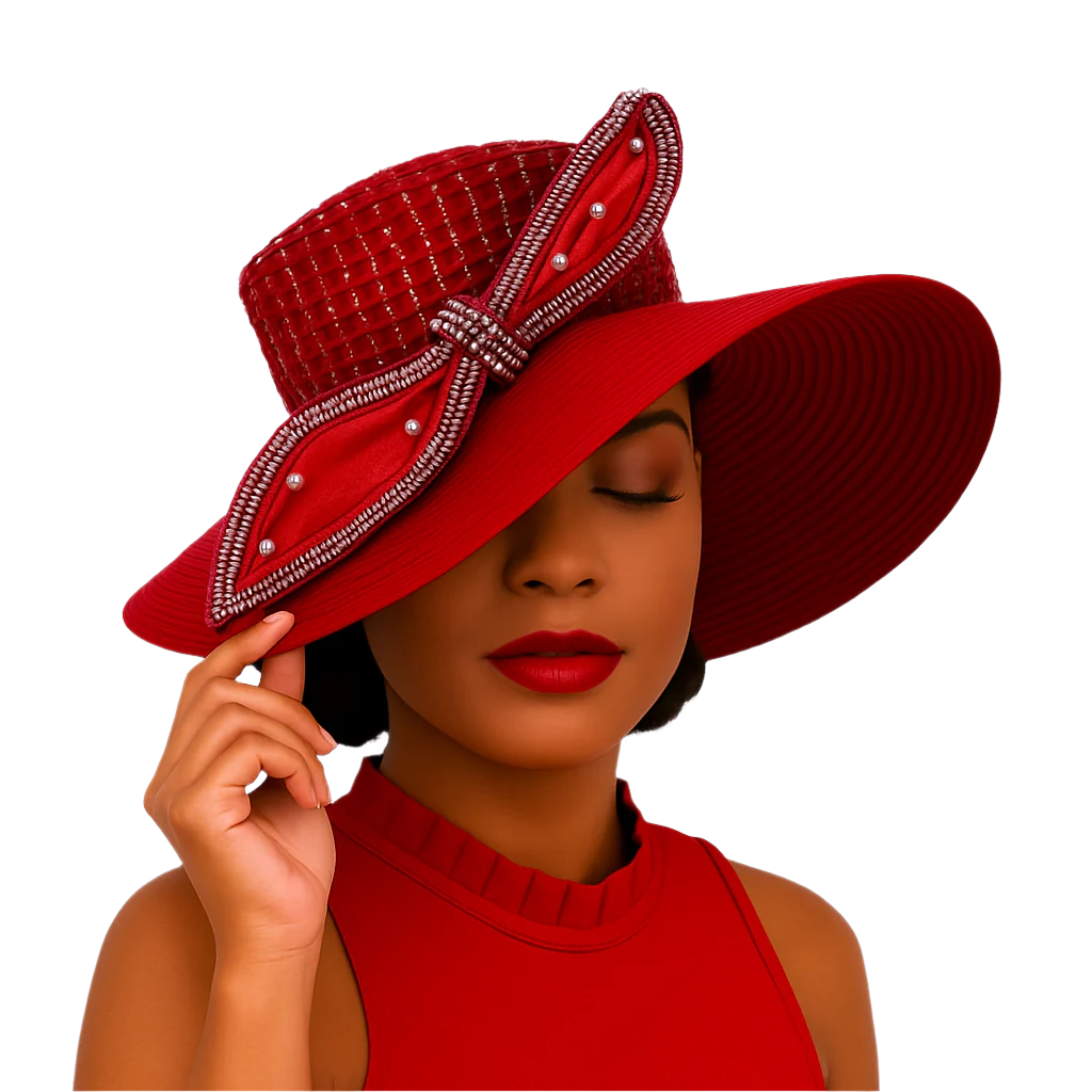 Step into elegance with this statement red wide-brim hat, crafted for unforgettable entrances. A quilted crown shimmers with interwoven threads while the dramatic sculptural bow sparkles with rhinestone accents. Designed to make a bold impression, the 5-inch structured brim curves with elegance. Whether for a derby, church, wedding, or gala, this show-stopping piece turns heads from every angle.