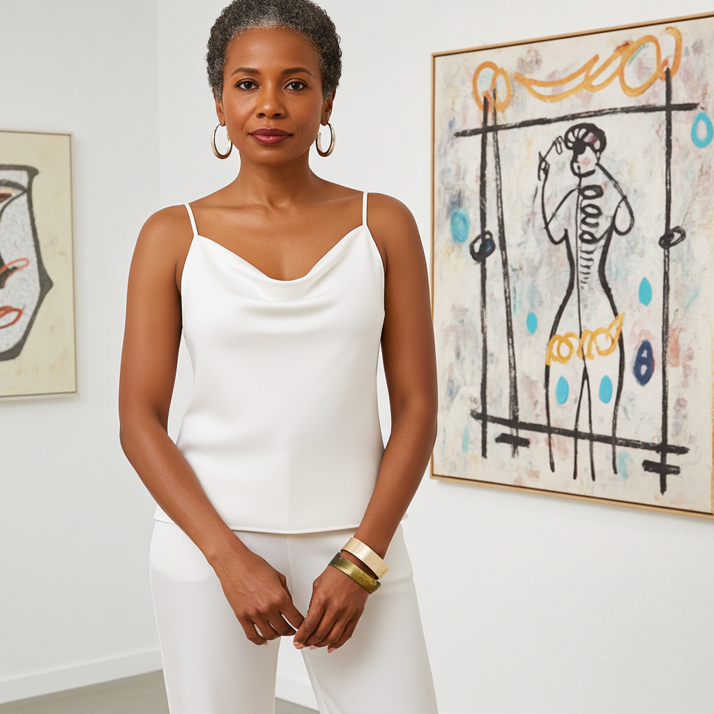Tank top from silky satin. 26" length (size S) Cowl neck Spaghetti straps Solid Woven 97% polyester, 3% spandex Machine wash cold, line dry Imported
