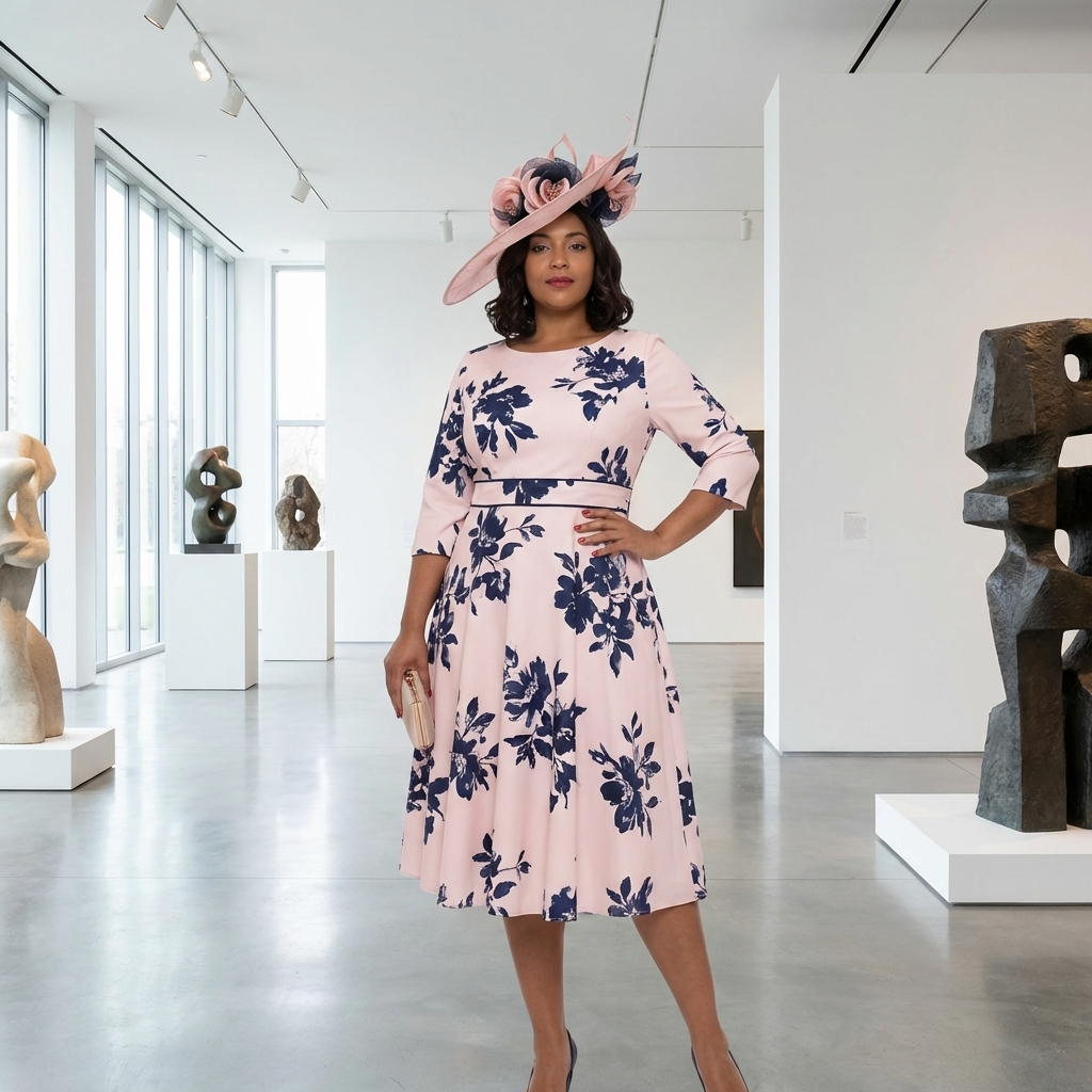 Crafted from lightweight sinamay, this headpiece features sculpted two-tone floral accents in soft blush and deep navy tones, creating striking dimension and visual interest. The airy weave provides structure without heaviness, making it comfortable to wear for extended events.