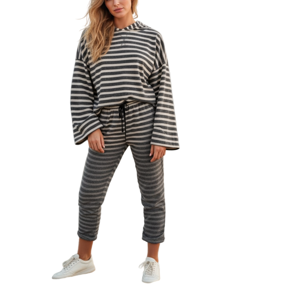This versatile chic top is perfect for low-key excursions or lounging indoors. It features an all-over striped print (taupe and black), a hoodie with drawstring closure, and wide extra long sleeves.