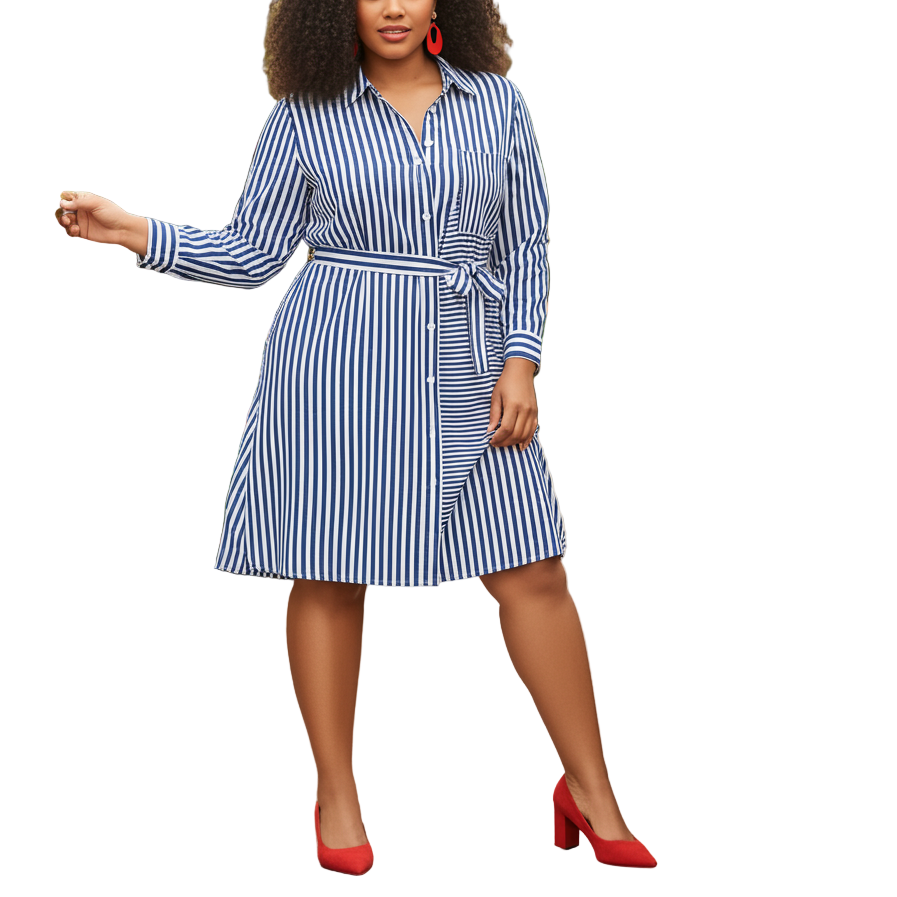 This relaxed striped shirt dress is unlined with exposed buttons, tie belt is perfect for day or evening.
